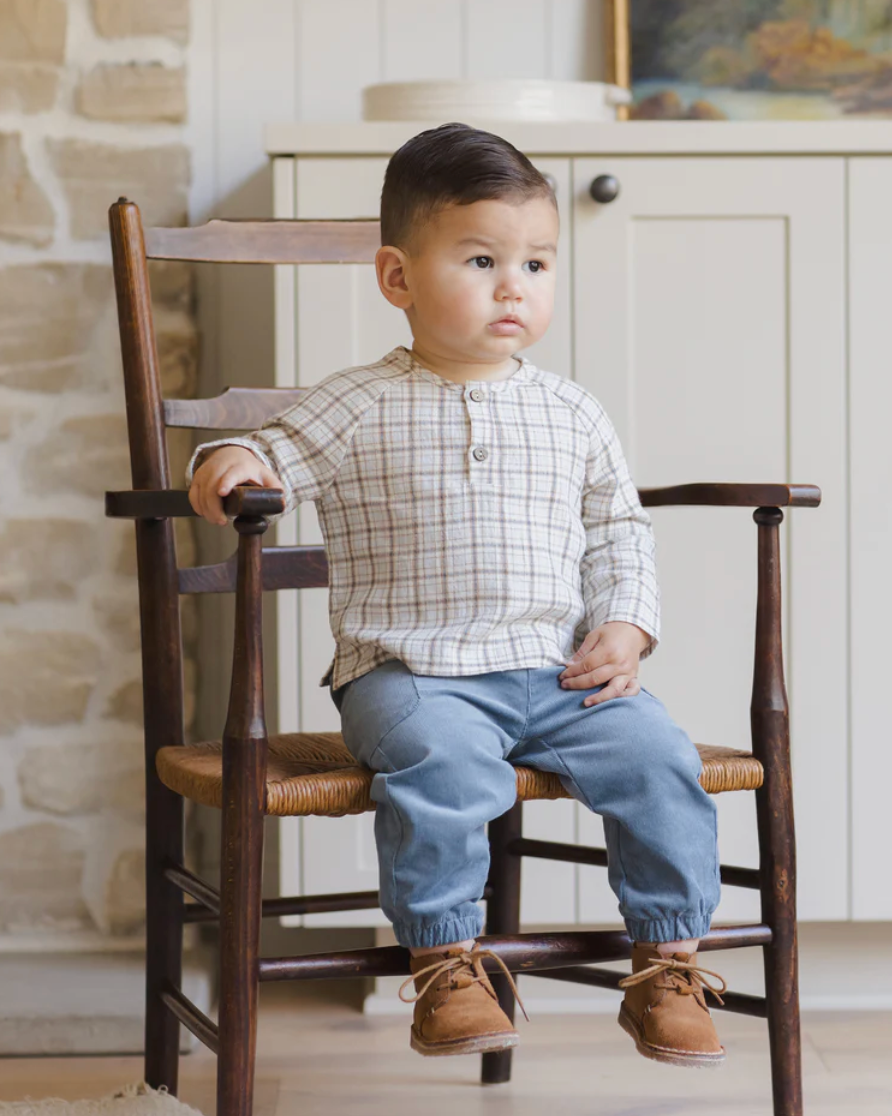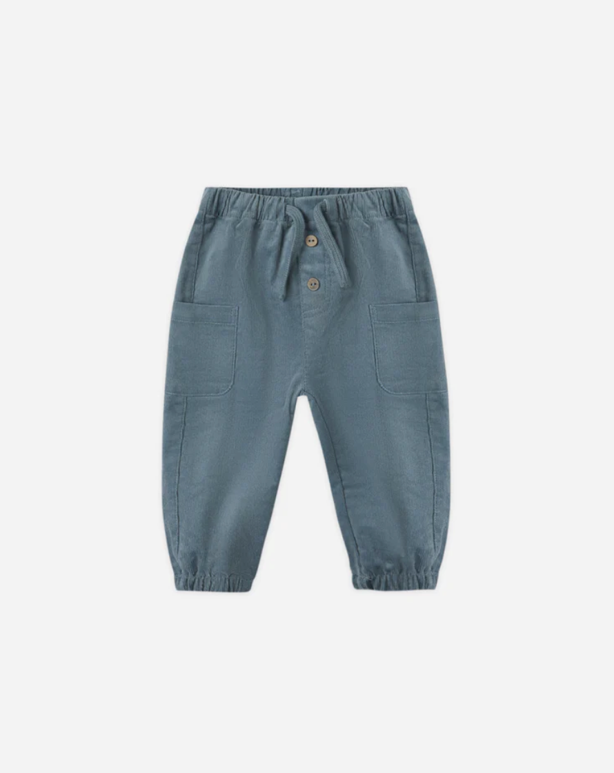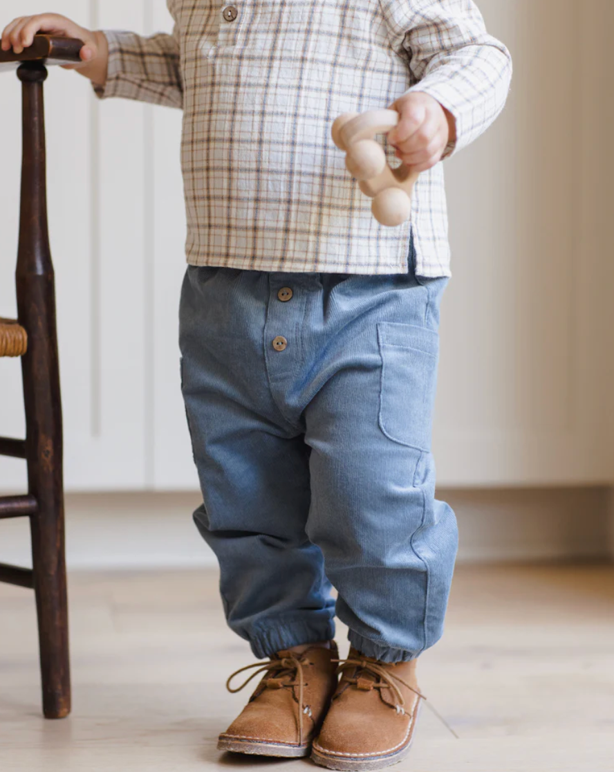 Comfortable corduroy pants with an elastic waistband and leg openings, adjustable drawstring, and side patch pockets.