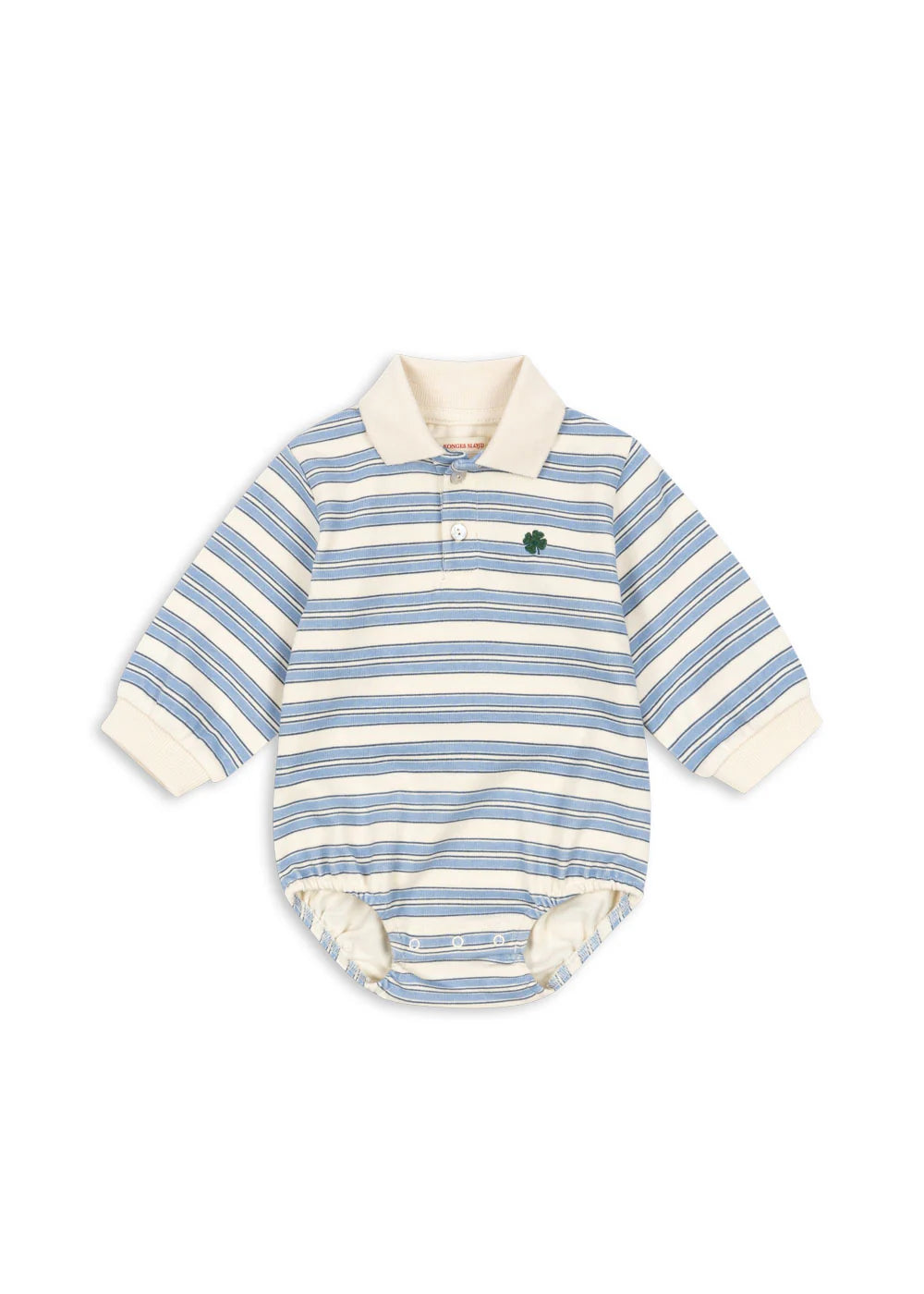 Soft organic cotton romper in a classic polo design. Features a regular collar, button placket, and push button closure at leg openings for easy dressing.
