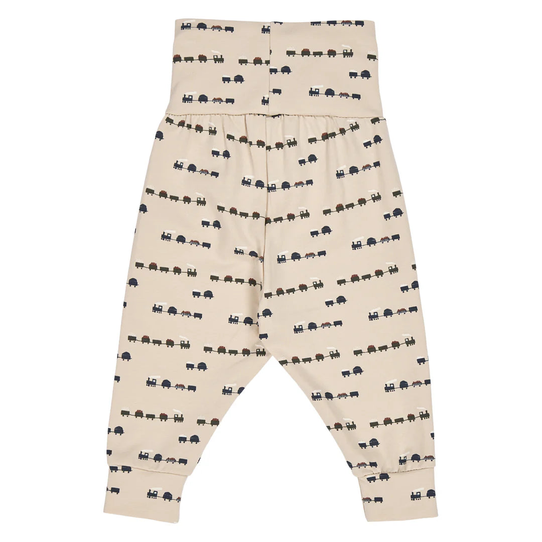 Sweet and comfortable pants with a fine all-over print of trains with train carriages in shades of green.
