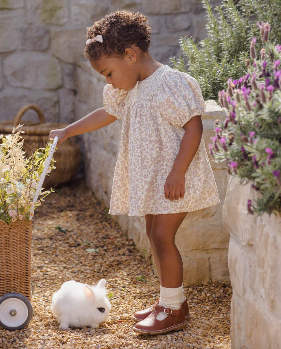 Babydoll dress with sweet bubble sleeves and beautiful diamond smocking around the neckline. Designed with buttons at the back for easy changes. Coordinating bloomers included with all sizes.