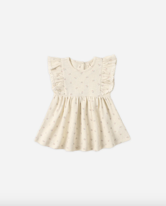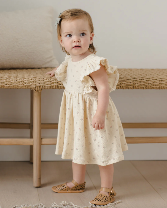 Ruffle sleeve babydoll dress made from our soft and breathable waffle knit cotton. Designed with back buttons for easy changes, and the sweetest crochet lace ruffle detail. Coordinating bloomers included with all sizes.