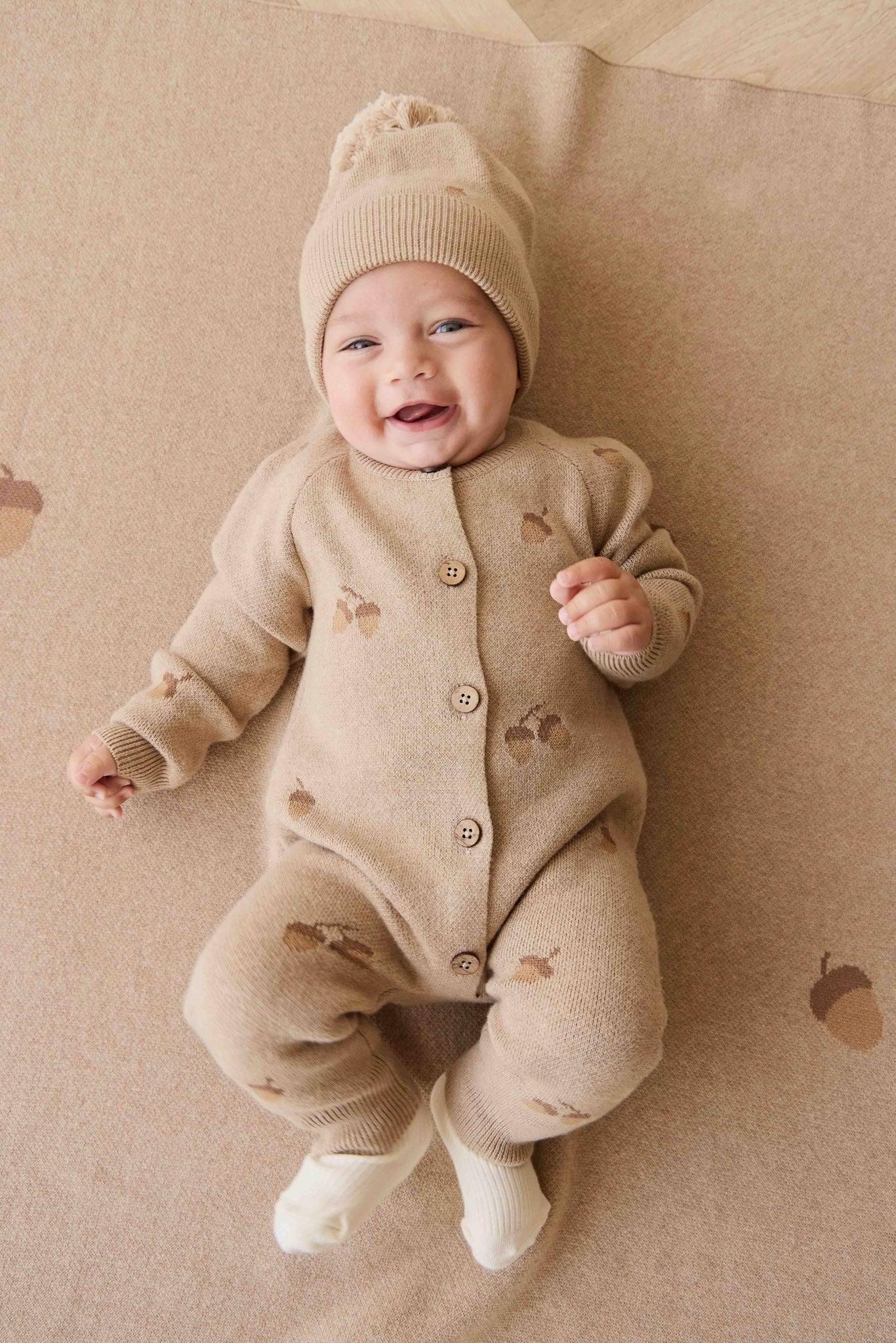 Keep your little one warm and cosy in the Easton Onepiece in Forest Acorns Cashew Marle. This beautifully knitted onepiece features a soft brown-taupe base with a charming acorn pattern, coconut buttons down the front, and ribbed cuffs for a snug and comfortable fit.