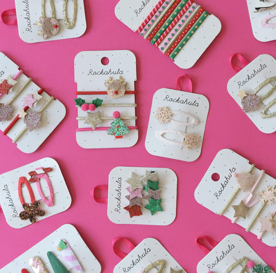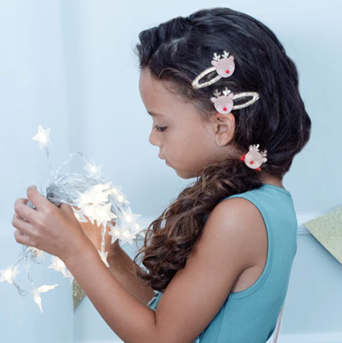 Our gorgeous little reindeer clips are the cutest addition to any Christmas outfit! With glittery gold antlers, the brightest red pom pom nose and secured to a gold ribbon wrapped snap clip. These clips make the perfect Christmas party accessory!