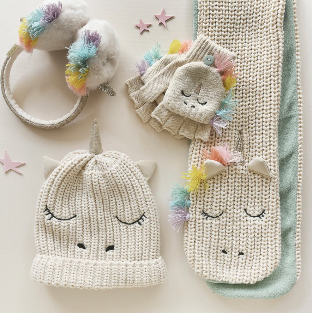 We believe in unicorns! Our unicorn earmuffs are made from the softest white faux fur, and are detailed with a brightly coloured tassel mane! Featuring a sweet embroidered face, a gold glitter horn and a gold glitter comfort fit headband, they are the most magical way to keep those little ears warm this winter!