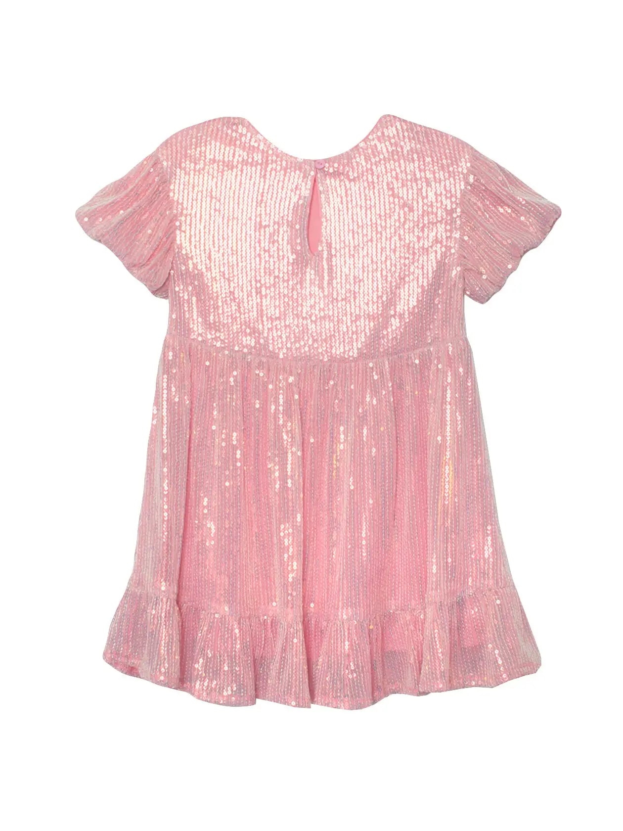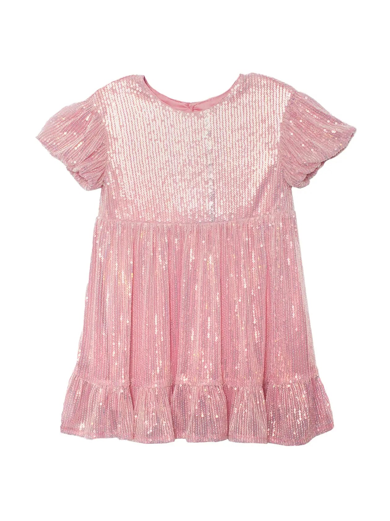 Make every moment shine with the Glitter and Glitz dress! This dazzling pink dress features a fully sequined bodice for ultimate sparkle, paired with puffed sleeves and a flared, pleated skirt for a playful touch. Finished with a ruffled hemline, it's perfect for twirling and ensures all eyes are on your little star.