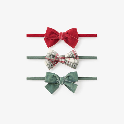 3 Pack Bow Headbands Red Velvet, Green Velvet, & White, Red & Green Plaid