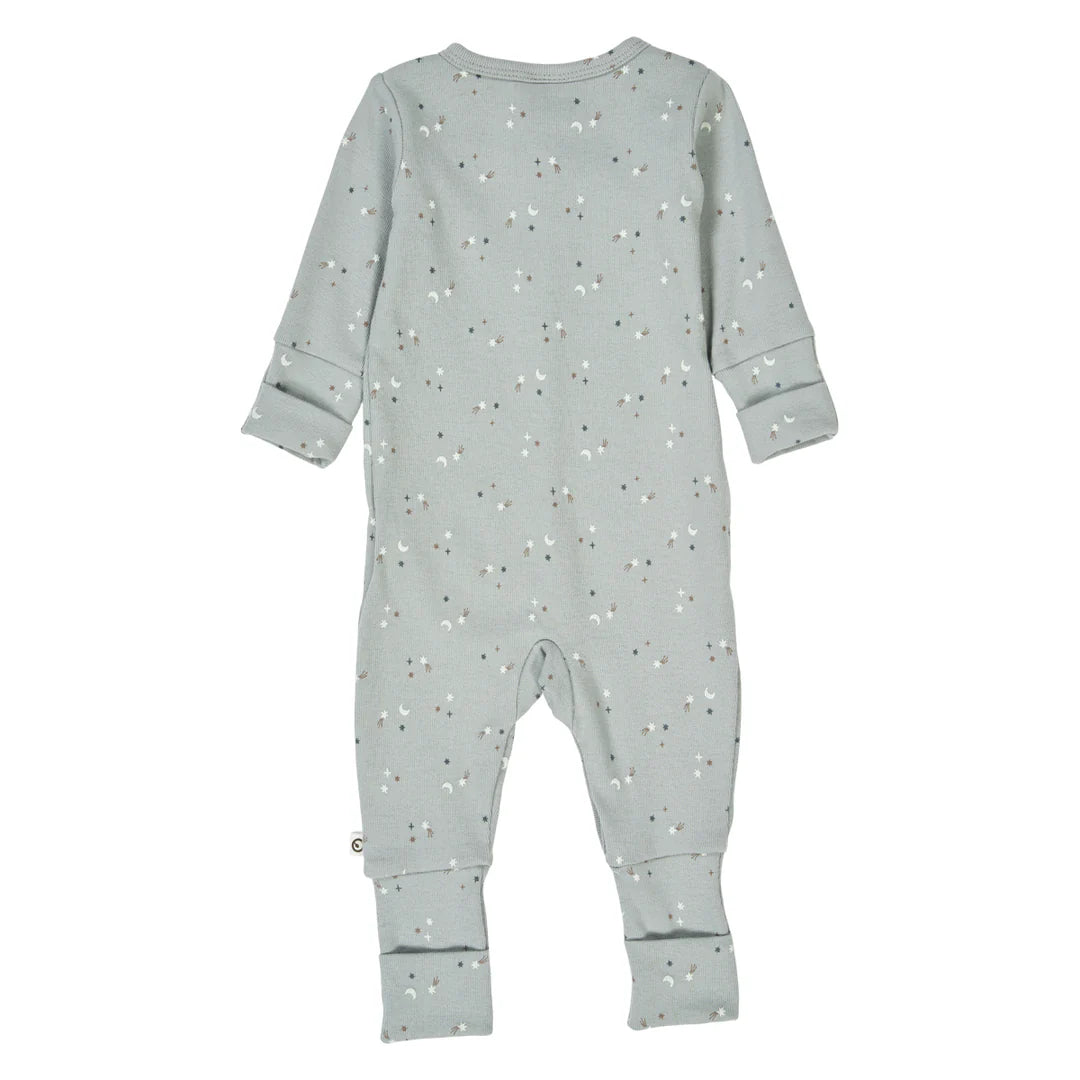 The bodysuit closes at the front with press buttons and has reversible feet and hands.
