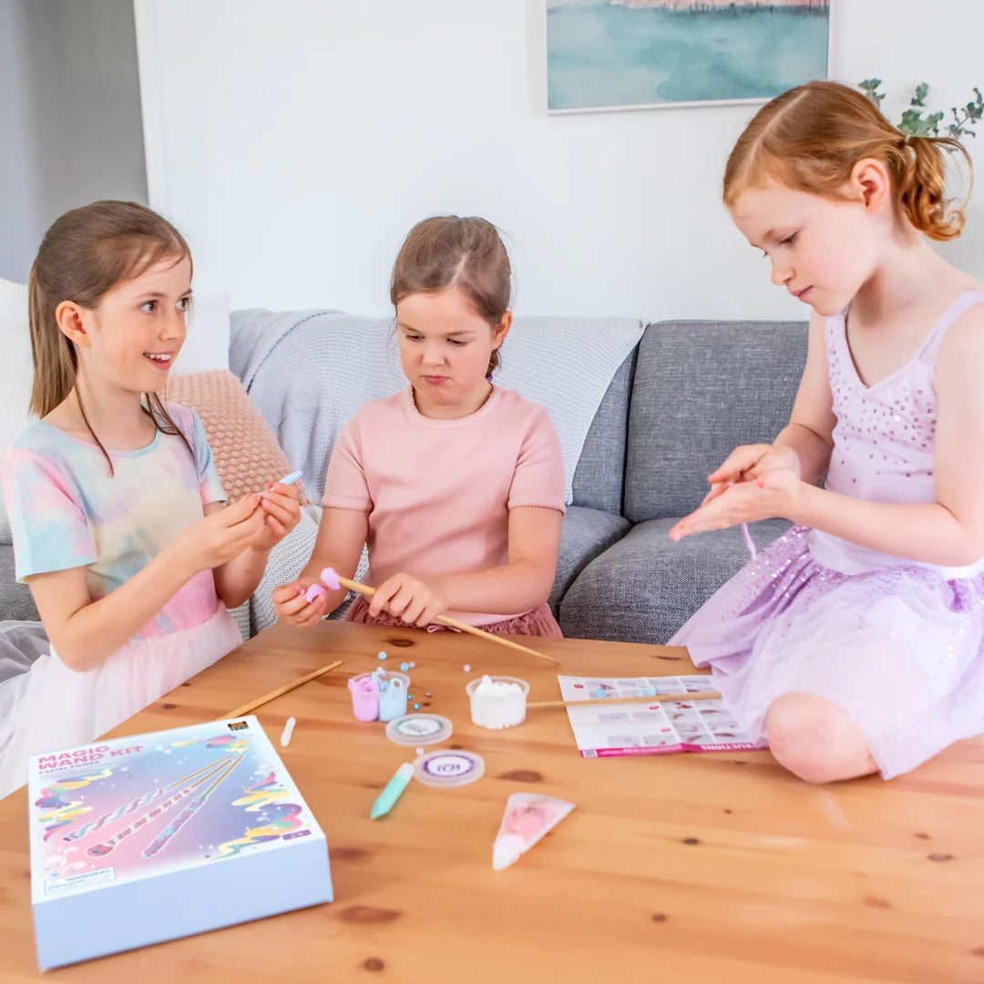 Perfect for enchanted little imaginations, this kit contains the tools required to conjure up 3 pastel toned, jewel-encrusted magic wands.