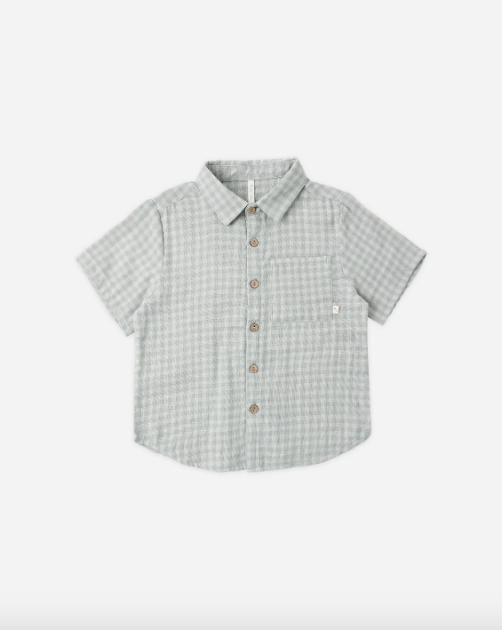 A classic collared boys short sleeve button-down shirt with coconut buttons.