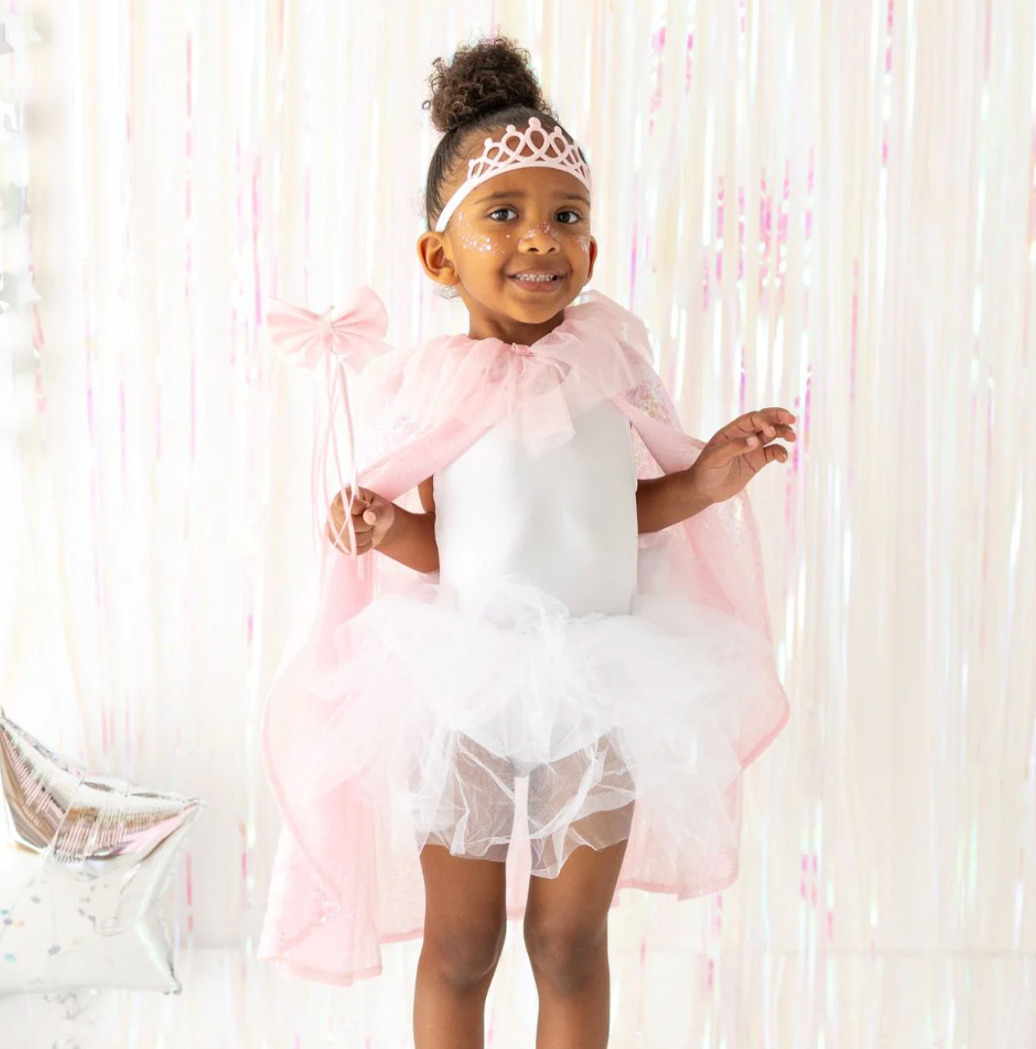 • 1 Cape: A soft, lightweight cape in a delicate pink hue and a subtle shimmer throughout. Easy Velcro closure makes it simple to wear.