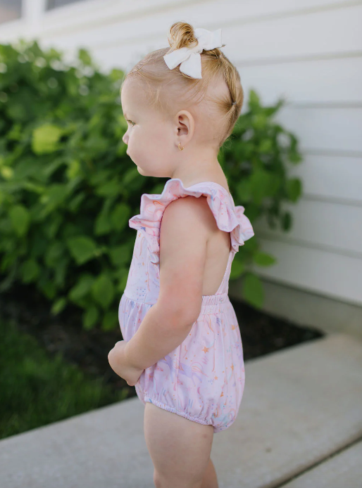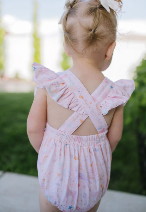 Designed for little movers, the Emmy Bubble combines comfort and style with its super soft, stretchy fabric that moves with your child. Delightful ruffled details adorn the shoulders and cascade down the back, adding a sweet touch. Plus, adjustable straps ensure a perfect fit as they grow.