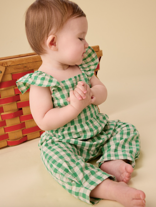 Designed to make dressing (and changing) easier while still feeling extra special, this flutter-sleeve romper is a sweet one-and-done option for baby's busy days. Soft 100% cotton seersucker keeps things light and breathable, while the lined bodice adds comfort and structure. Thoughtful details like an elastic neckline and back waist help with quick on-and-off moments, and snaps at the inseam simplify diaper changes. Finished with flutter sleeves and playful pleats at the legs, it's a charming choice on its own--and even better when coordinating with matching family styles for photos, celebrations, and everyday milestones.