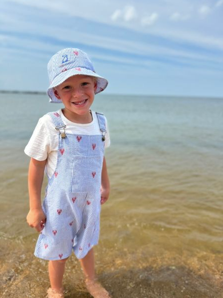 Featuring an adorable lobster print paired with a blue and white seersucker stripe, these overalls bring a playful, coastal-inspired vibe that’s perfect for beach days, family outings, or casual adventures.