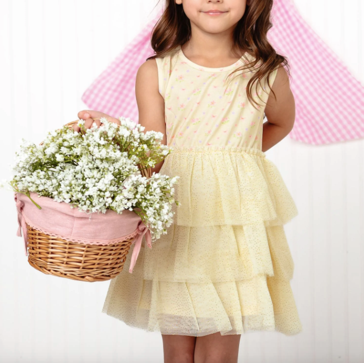 This darling dress combines a sweet, soft printed top with three dazzling layers of yellow tulle, making every twirl a magical moment.