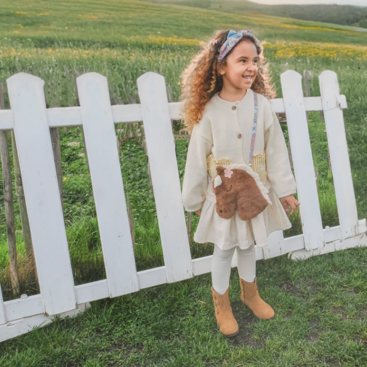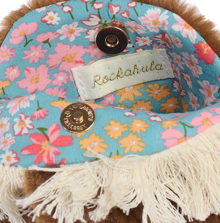 Giddy up Pony! Our Peggy Pony Bag is made from brown super soft faux fur with a sweet tuff mane and a little pink flower. This bag features a magnetic dot closure, our heidi floral fabric lining and adjustable strap with a break point for safety.