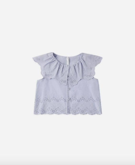 Our Remi Blouse features a charming oversized collar with scallop embroidered eyelet detail and front buttons for a sweet finish. Pair with our Remi Short to complete the look.