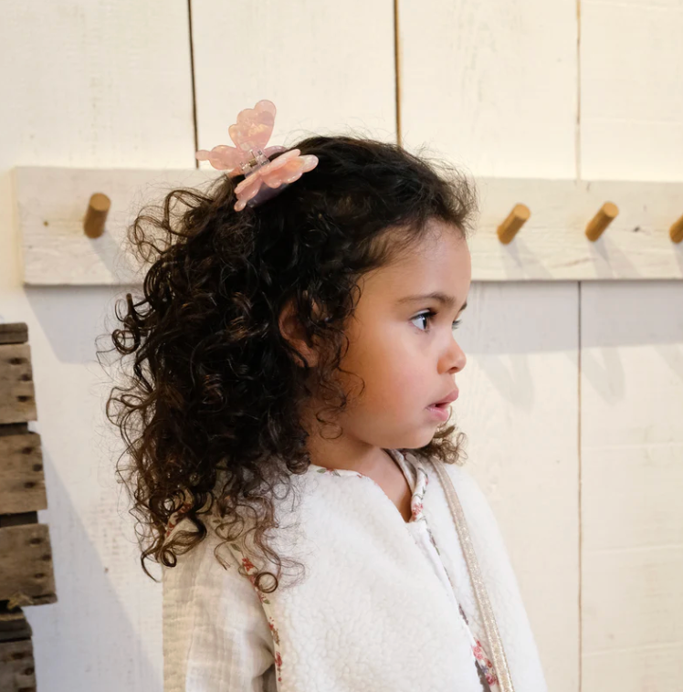 Designed with little ones in mind, our shimmer butterfly claw clip adds a touch of whimsical charm to any hairstyle! Made in a shimmering pink acetate with little grippy teeth to hold hair in place whilst little ones twirl, spin and flutter like a little butterfly.
