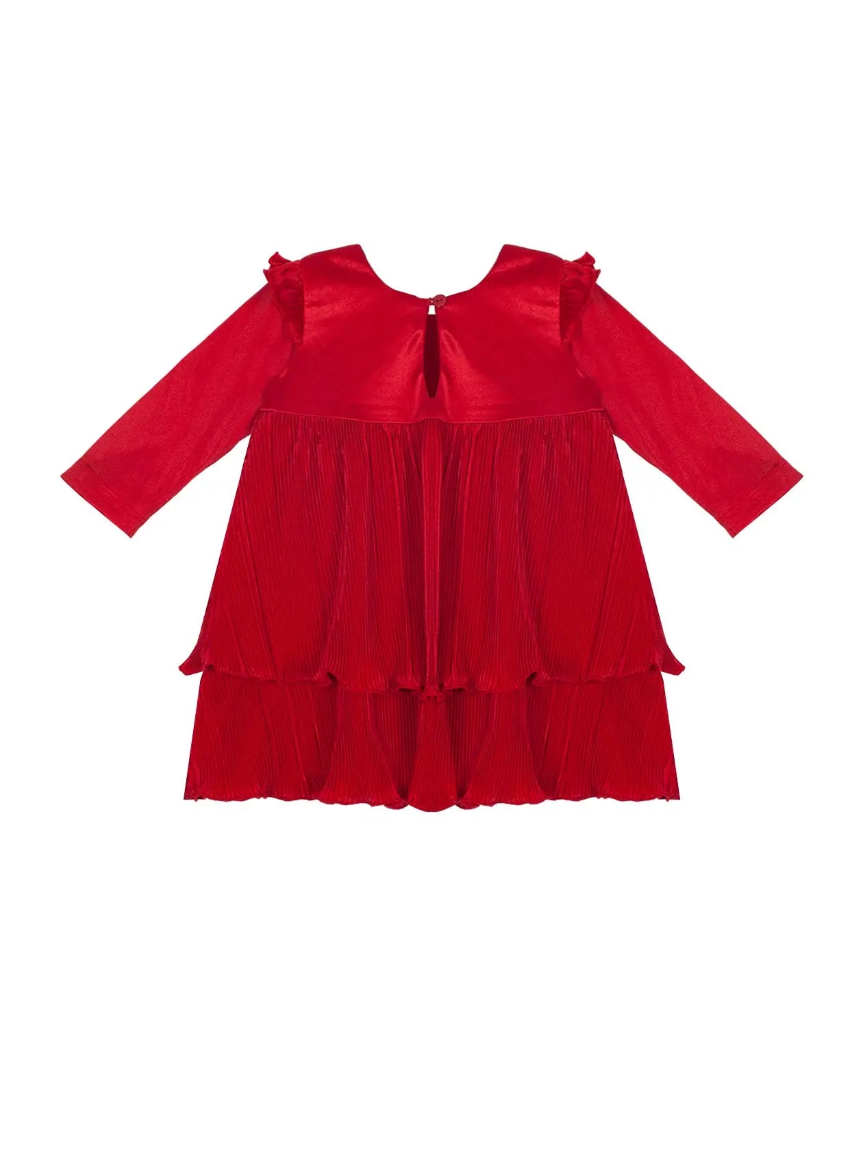 Celebrate the season in the Merry 'n' Bright Dress, a stunning red velvet creation. This dress features playful ruffled shoulders and layered pleated satin skirt that twirls delightfully. Its rich, vibrant red shade makes it an ideal choice for holiday photos or festive gatherings.
