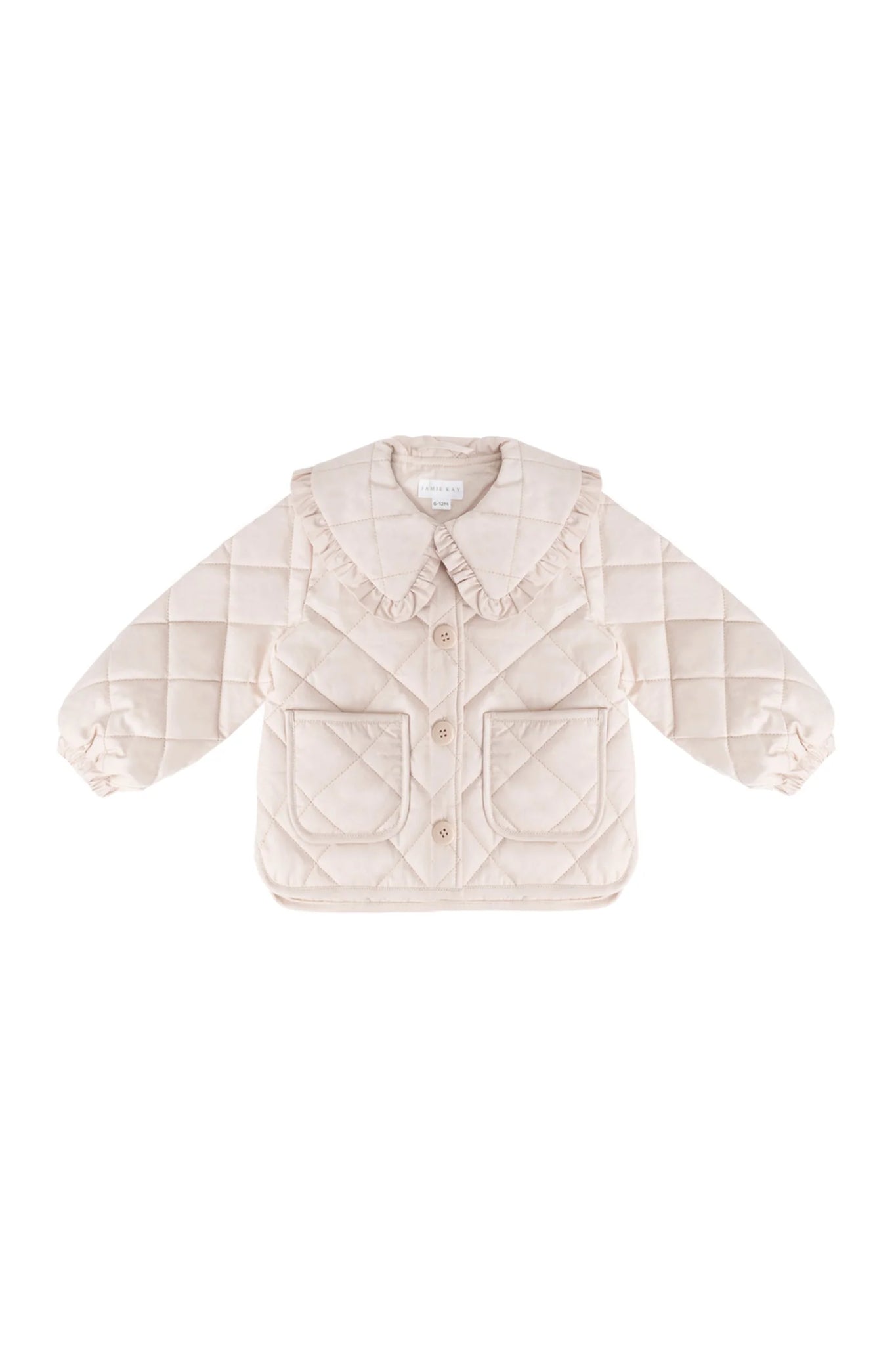 Wrap your little one in warmth and whimsy with the Kora Jacket in Berry Cloud, a beautifully quilted puffer jacket on a soft pinky-berry base. With a charming frill collar, front buttons, and two handy pockets, this jacket is as practical as it is pretty – perfect for layering on cooler days.