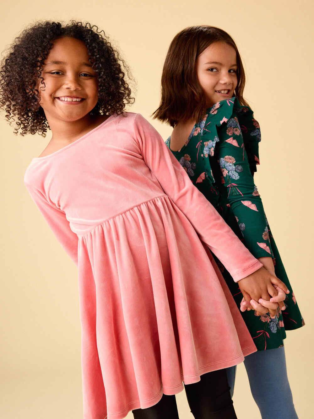 A true touch of luxe! Designed to dazzle, our heirloom-quality velour ballet dress promises warmth, elegance, and endless twirls. With a fitted bodice, classic boat neckline, and circle skirt, this piece will see them through the holidays and beyond. Below mid-thigh length. Crafted of stretchy cotton/spandex. Fitted bodice and circle skirt.